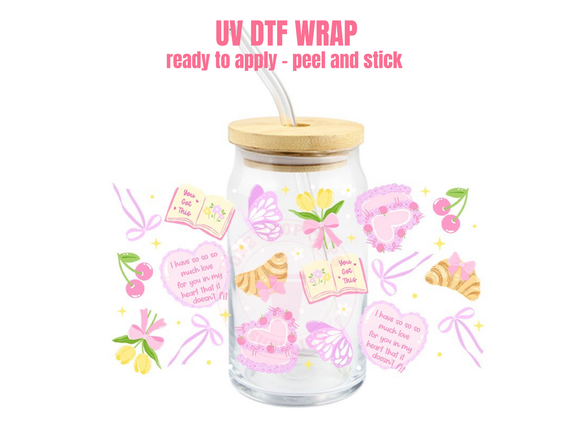 This listing is for one (1) UV DTF adhesive cup wrap for a 16oz Glass Cup size.